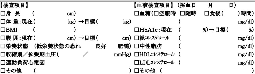 検査の欄には身長、体重、血圧、血液検査の結果などのデータを記入します。現在の数値を患者と共有することが目標設定の第一歩です。