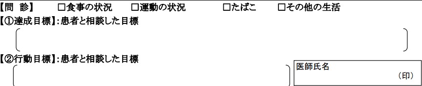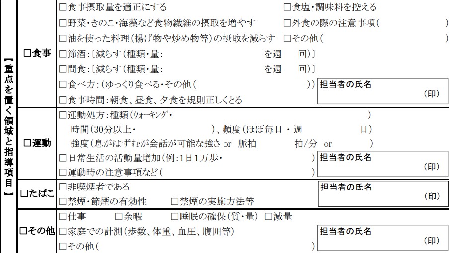 食事や運動、休養、喫煙、飲酒など生活習慣の各項目について、具体的な指導内容をチェックまたは記入します。管理栄養士が栄養指導を行うなど、多職種連携を行うことも可能です。
